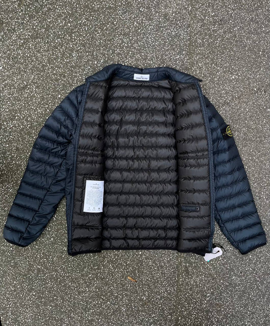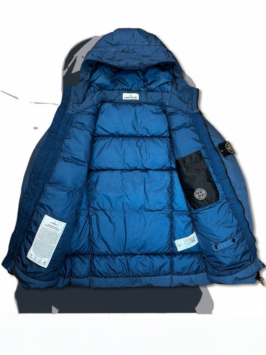 Brugt Used Stone Island Dunjakke i Navy farve L large Garment Dyed Crinkle Reps Ny Down