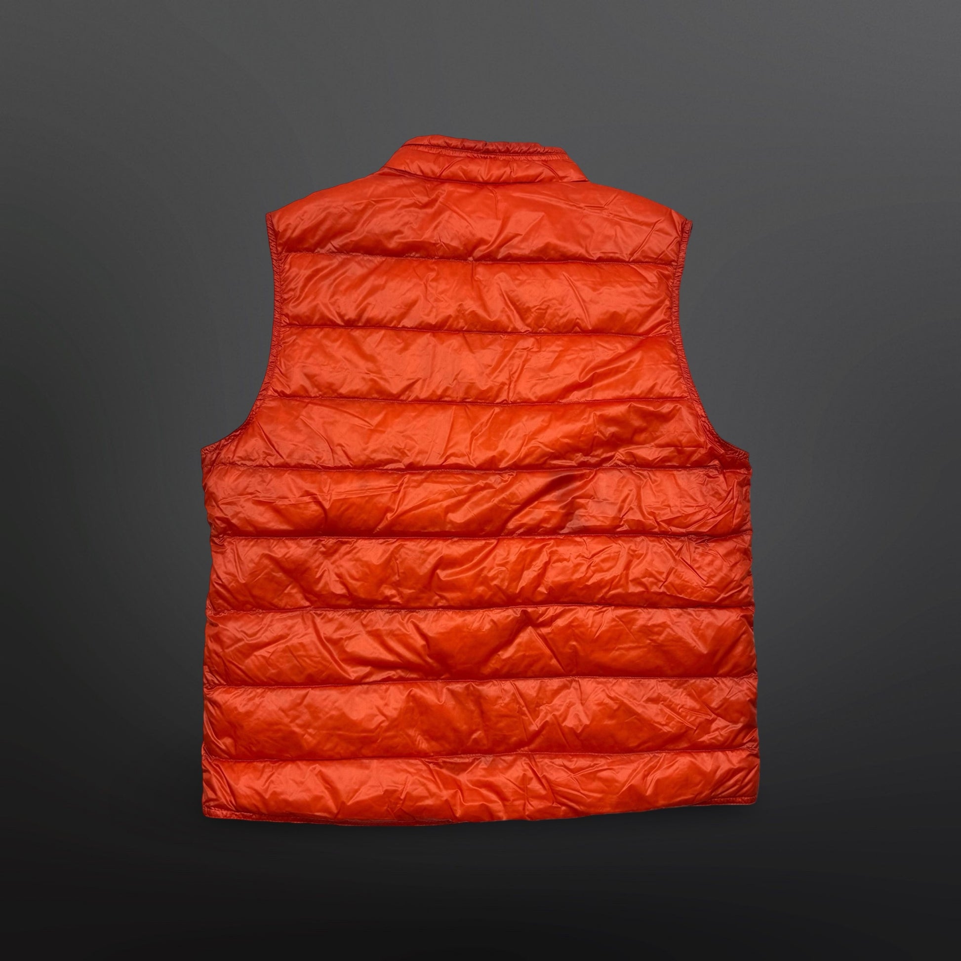 Original Moncler dunvest i en markant orange farve. Klassisk quiltet design med let dunfyld, der giver god varme uden at fylde. Vesten har lynlåslukning og sidelommer med lynlås samt det ikoniske Moncler badge på brystet. Perfekt til lag-på-lag over hoodie, strik eller sweatshirt.