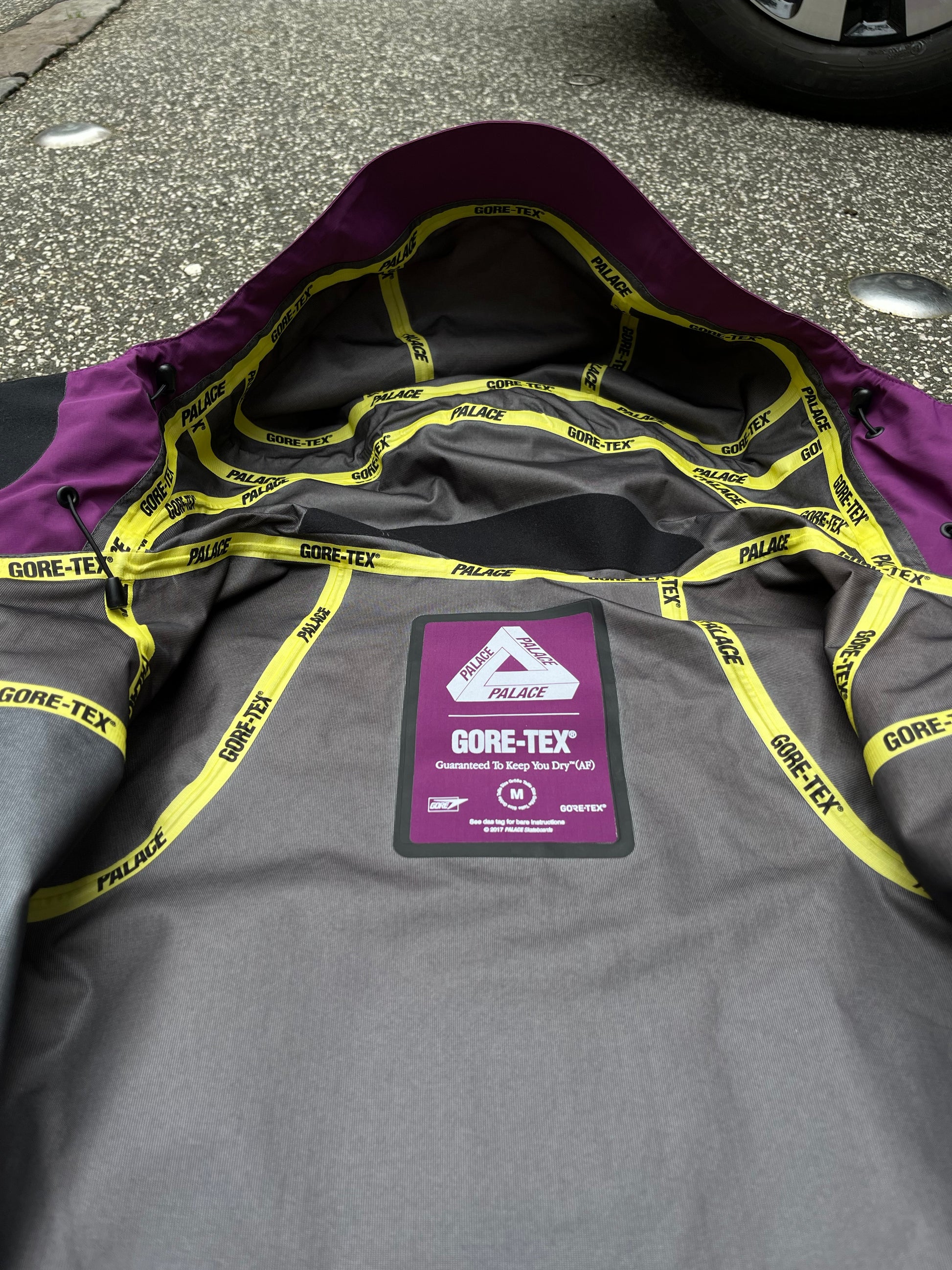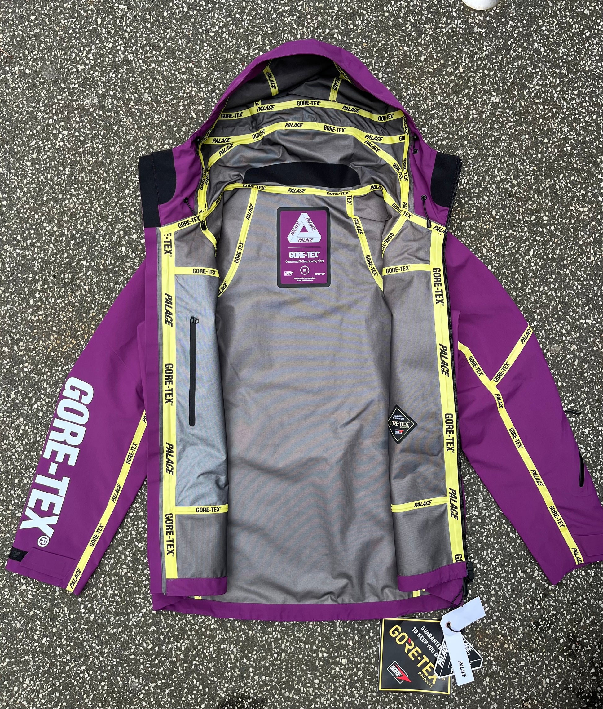 • Gule seam-tapes med “PALACE” og “GORE-TEX” branding