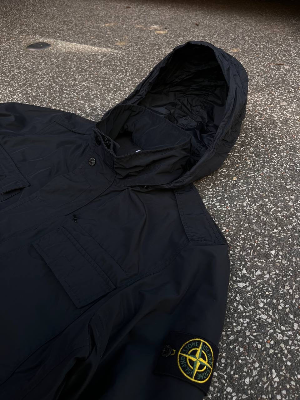 Jakken har en skjult hætte, som nemt kan foldes ud ved behov, og taljen kan spændes ind, så du kan tilpasse pasformen efter ønske. Den ikoniske Stone Island kompas-patch sidder naturligvis på venstre ærme.