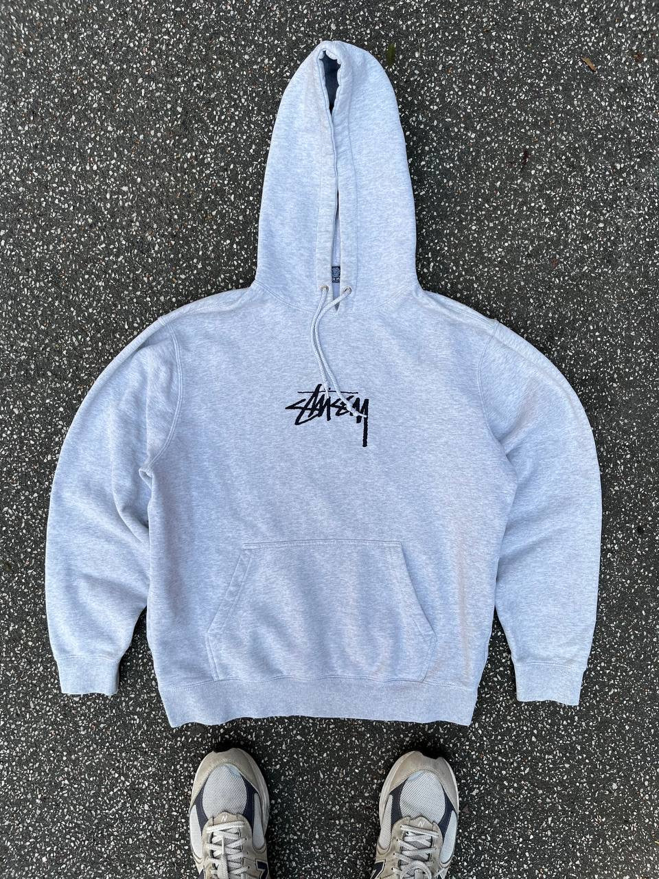 Klassisk grå hættetrøje fra Stüssy med det ikoniske logo printet på brystet. Lavet i blød og behagelig bomuldsblanding med kængurulomme og justerbar hætte.