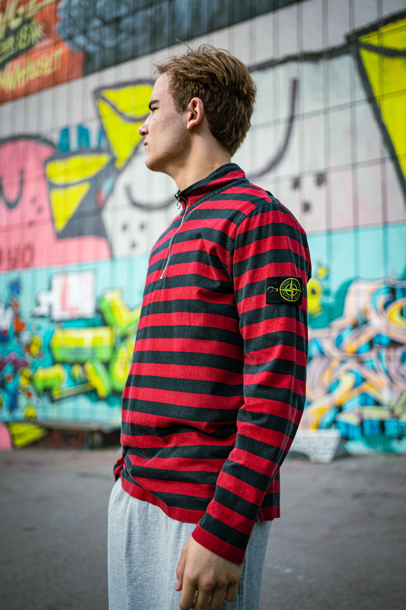 Sjælden langærmet trøje fra det ikoniske samarbejde mellem Supreme og Stone Island. Lavet i kraftig bomuld med klassiske røde og sorte striber, lynlås ved halsen og broderet “SUPREME” på ryggen. Udstyret med det aftagelige Stone Island badge på venstre ærme – et must for samlere.