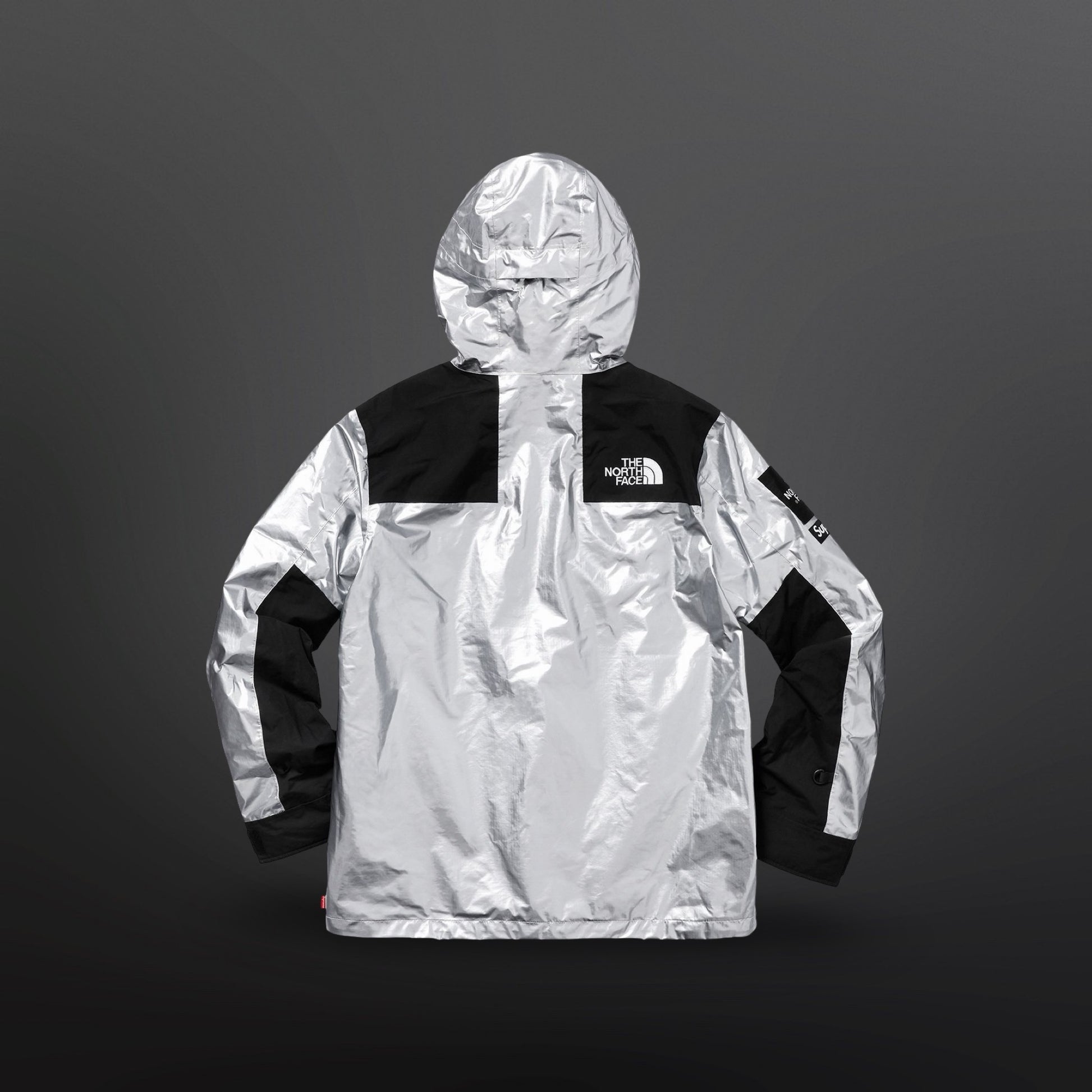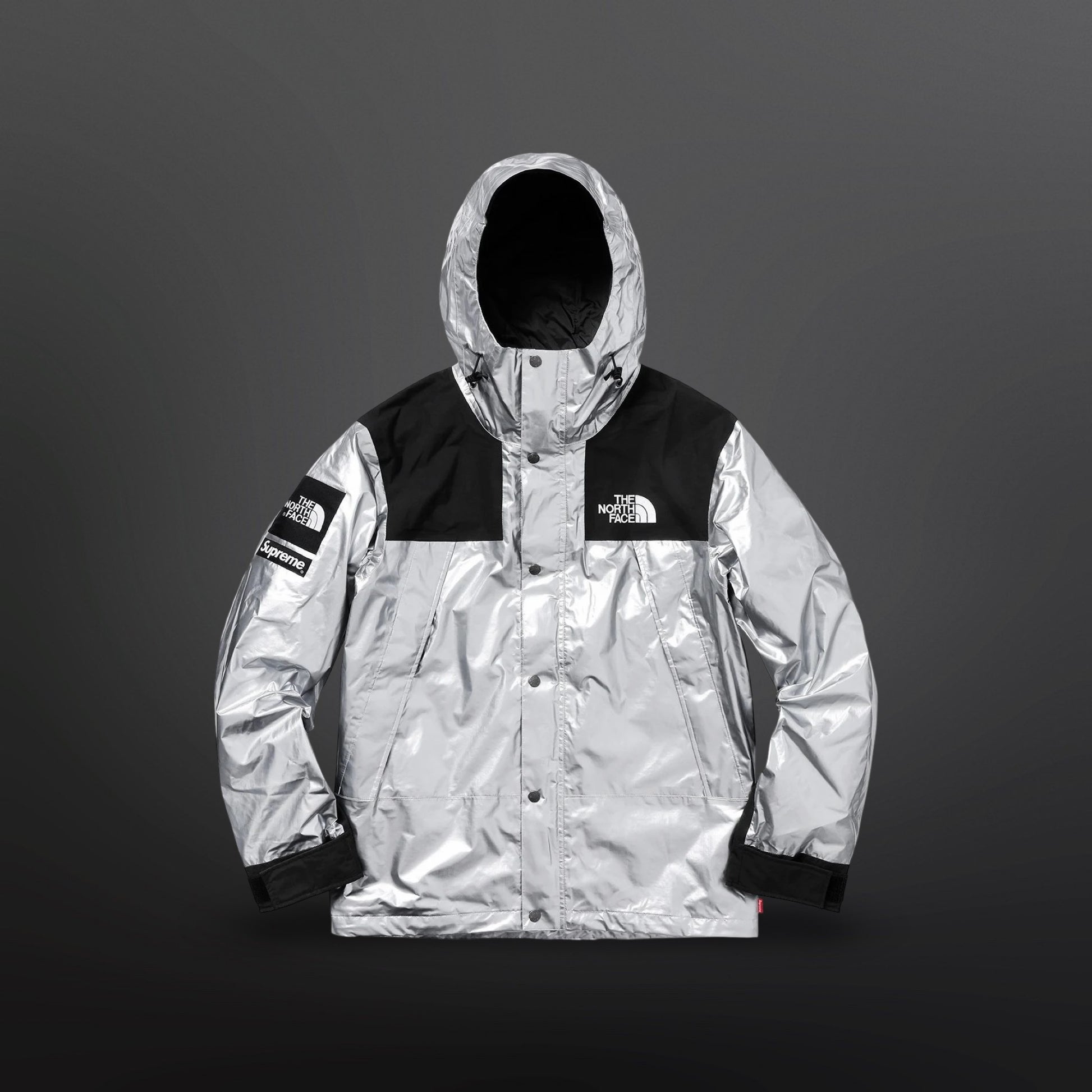 En stærk og clean Supreme x The North Face collab i sølv/sort farvekombination. Klassisk Mountain Jacket silhuet med tydelige logo placements og teknisk finish.